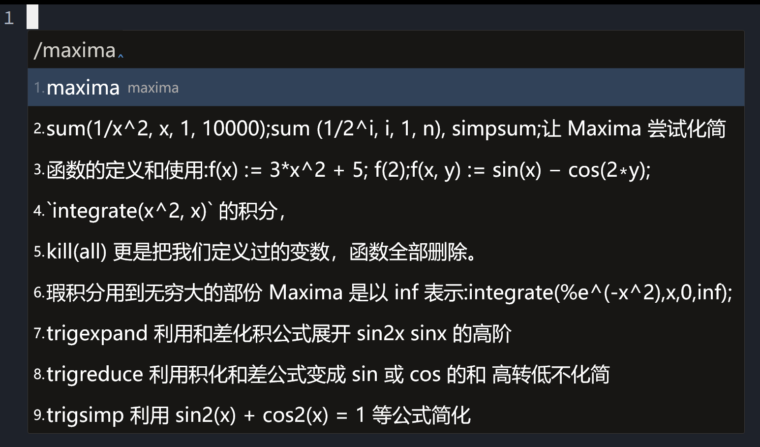 编程语言的函数命名往往非常相似,差一个字符就可能导致错误。因此,我将这些函数添加到我的输入法中。当我需要临时查看它们的使用方法时,只需输入 /maxima